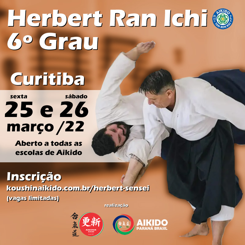 É com muita satisfação que teremos a presença do sensei Herbert Ran Ichi, faixa preta 6º grau e atual presidente do grupo Tan Ren Kai para um seminário técnico em Curitiba. Sensei Herbert é residente na cidade de Fortaleza onde lidera o Aikido naquela região. Foi Uchi deshi (aluno interno) do Shihan Reishin Kawai e traz para Curitiba toda experiência e prática adquiridas ao longo de décadas de dedicação ao Aikido.